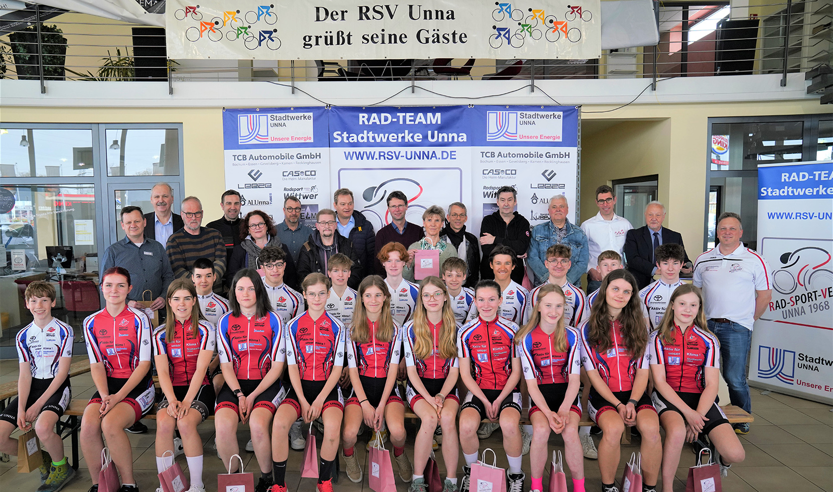 Zum Beginn der Rennsaison präsentierte der RSV Unna sein Sportteam 2023 der Öffentlichkeit. Die große Ausstellungshalle von Toyota TCB in Kamen bot gute Voraussetzungen für die Vorstellung der Sportler und Trainer. Landrat Martin Wiggermann und Unnas Bürgermeisterin Simone Hackenberg stellten in ihrer Grußworten die dynamische Entwicklung der Nachwuchsabteilung des RSV in den Vordergrund. Ilka Essers überbrachte Grüße des Sportausschusses der Stadt, Andreas Voß berichtete über die gute Verbindung zum Kreissportbund und der Stadtsportverbandsvorsitzende Volker König betonte die enge Zusammenarbeit mit dem RSV Vorstand in seinem Grußwort. Der RSV Vorsitzende Hans Kuhn begrüßte danach Stadtwerkechef Jürgen Schäpermeier , Wolfgang Brettschneider vom Alu Werk Unna, Hendrik Schulze-Hesselmann, Michael Schröder und Oliver Kurbjuhn als anwesende Förderer des Vereins, ohne die die kostenträchtige Sportart für manche Eltern und ihre Kinder unerschwinglich wäre. Sparkassen Vorstand Frank Röhr übergab passend an die Geschäftsführerin des RSV, Maria Böhm, zur Unterstützung der Jugendarbeit unter großem Beifall der Sportler einen hochdotierten Scheck, bevor TCB Abteilungsleiter Peter Müller den Gästen die Vorteile des Toyota Hybrid-Renndienstwagens in der Trainingsbegleitung erklärte. Der RSV Vorsitzende bedankte sich danach beim Radtourenteam des RSV unter Leitung von Carsten Bültmann und Anja Holstiege, das im letzten Jahr eine große Radtourenveranstaltung und Anfang dieses Jahres eine CTF, eine Country-Touren-Fahrt, erfolgreich organisiert hat. Beginnend mit den Jüngsten kamen dann die Rennsportler/innen einzeln die „Showtreppe“ herunter. Hans Kuhn nannte ihre Erfolge und die Ehrengäste übergaben eine Tüte an jeden Sportler, die mit Süßigkeiten und einem Mehrzweckhalstuch mit Vereinsaufdruck gefüllt war. Besonders hervorgehoben wurden die Landesmeistertitel in verschiedenen Disziplinen von Josefine Wendel, der Deutsche Vizemeister von Lasse Schenkmann und natürlich der Deutsche Meistertitel von Jonathan Müller.